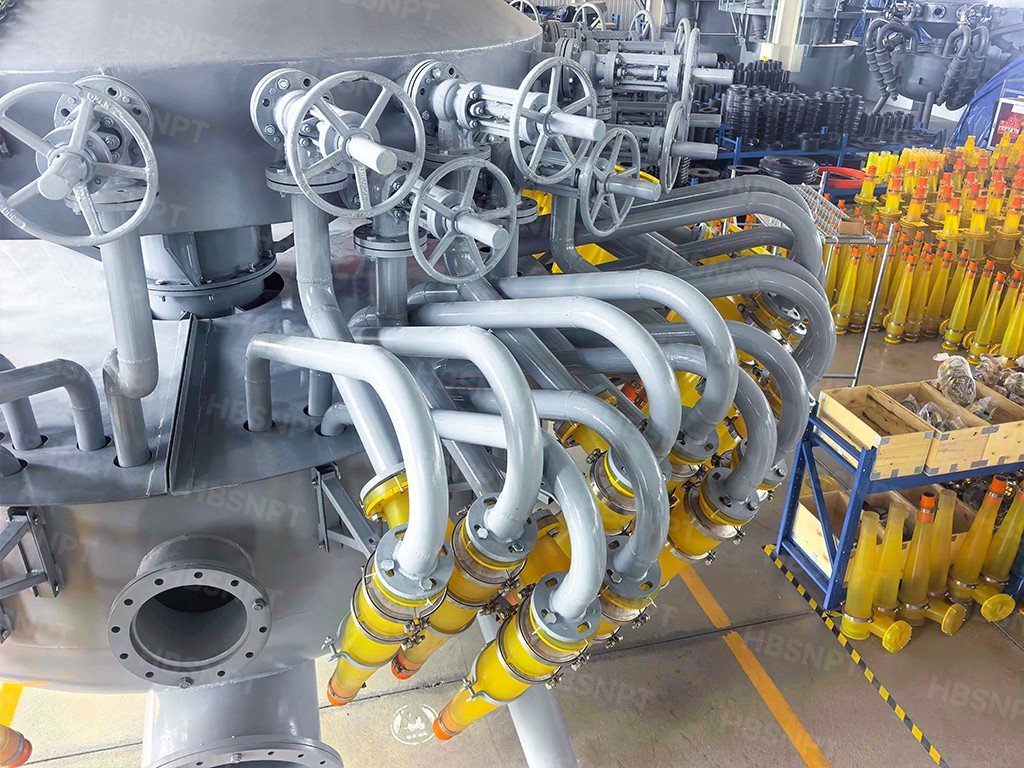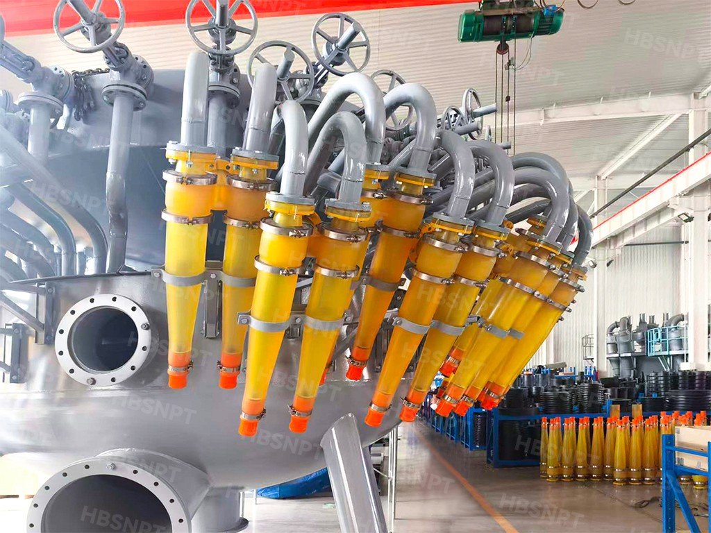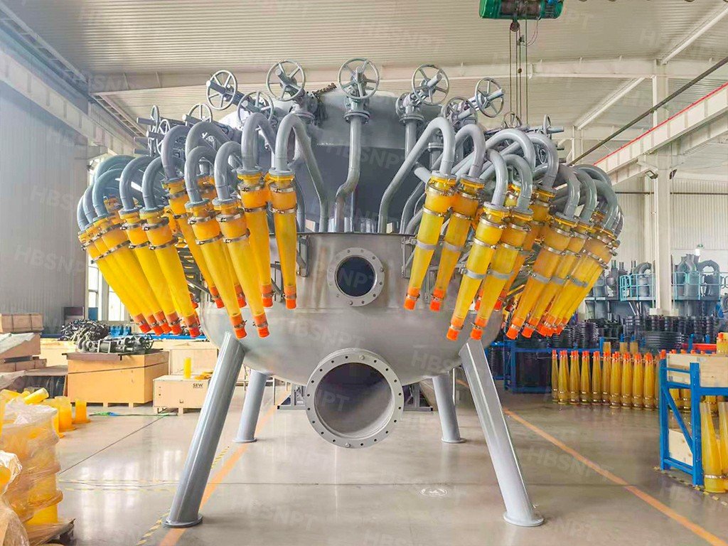 本次交付设备包括:2组SNPT200×2-17(15)分解旋流器组、2组SNPT100×2-PU-40分解旋流器组,以及3套φ2.0×4.5m回转除渣筛。以上设备均为氧化铝生产流程中的关键装备,其中分解分级子项旋流器主要承担成品氢氧化铝与细种子氢氧化铝的分级分选作业,回转除渣筛则用于矿浆除杂净化,保障后续工序稳定高效运行。